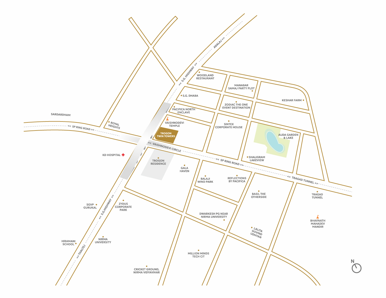 Located at Vaishnodevi Circle on SG Highway, TTT offers seamless connectivity to major commercial zones of Ahmedabad. Key landmarks like Palladium Mall (14 mins), Nirma University (6 mins), and SGVP International School (15 mins) are just minutes away, making it ideal for businesses, professionals, and investors.